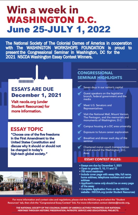 The Contest: The Congressional Essay Contest is an annual contest run by The National Society of the Colonial Dames. Every fall, high school students are invited to write a 750-word essay about the functions of our government. The NSCDA selects the best-conceived and articulated essays and awards winners with scholarships to its Congressional Seminar the following summer. (As many as 50 scholarships are awarded annually.)